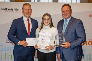 Junge Heldin: (v.l.n.r.) Kai Tusak, Vorstandsmitglied Sparkasse Fürth, Ronja Ehni, Junge Heldin und Landrat Bernd Obst | Foto: Landkreis Fürth